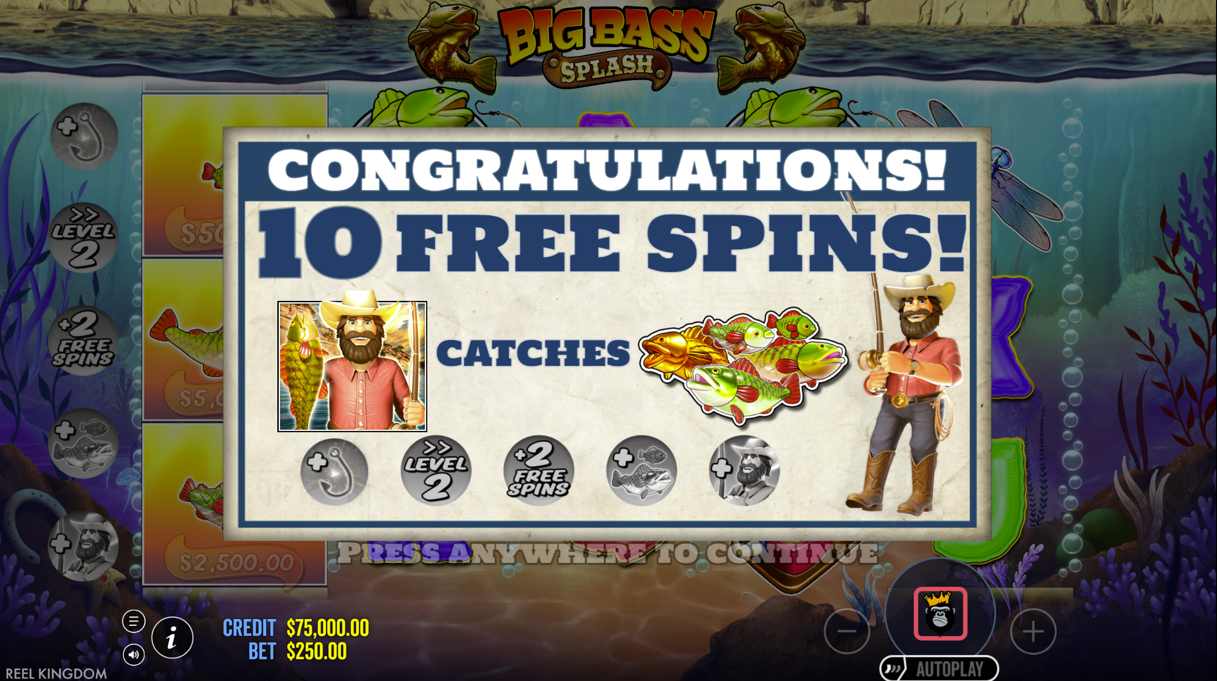 The free spins round is arguably more satisfying than in the original. With the Fisherman Wild permanently stuck to reel 5, every money symbol that lands is automatically collected, and each collection adds an extra free spin. This creates a potentially endless bonus round where skilled play (and good luck) can lead to extended, rewarding sessions.